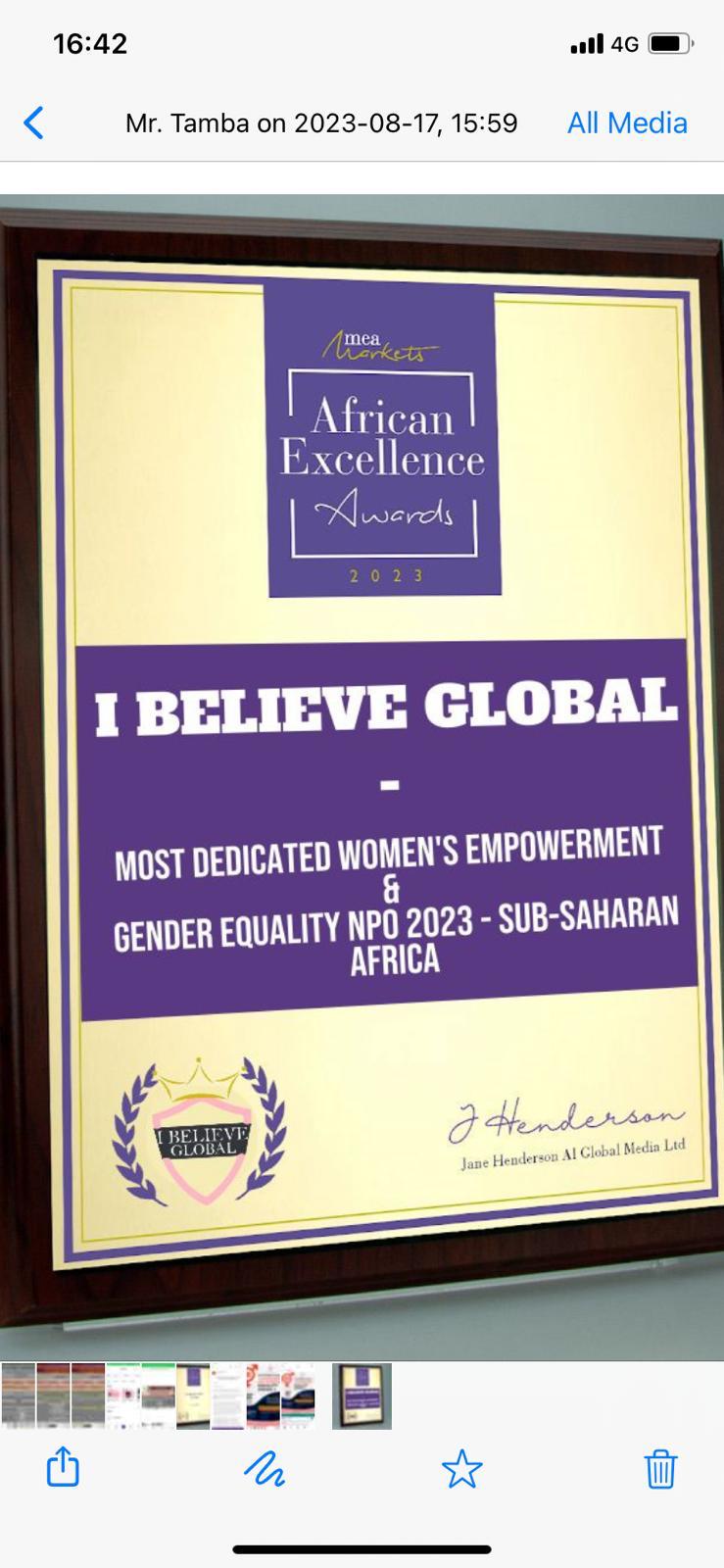 I Believe Global (IBG) has been honored with the African Excellence Award for Most Dedicated Women’s Empowerment & Gender Equality NPO 2023 – Sub-Saharan Africa, presented by MEA Markets.